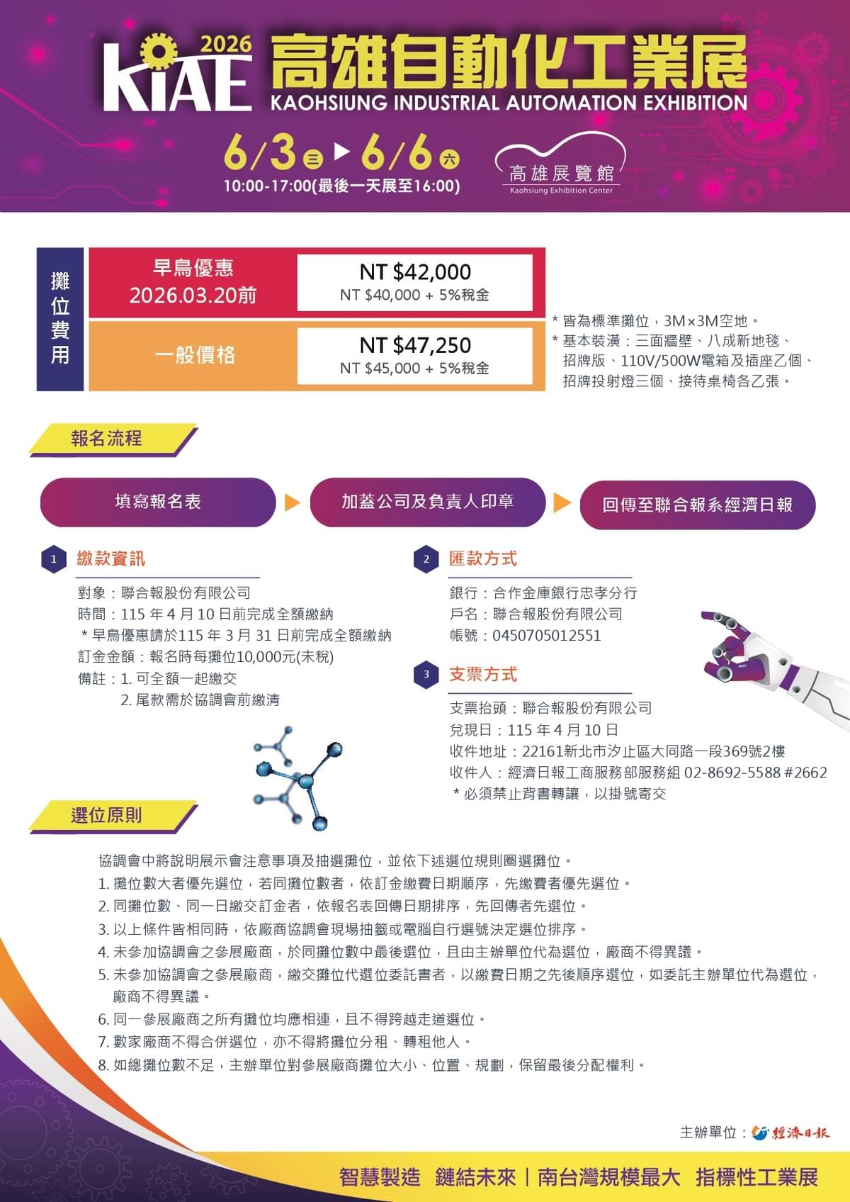 開放早鳥報名至115年3月20日,早鳥優惠價每攤位只要新台幣 42,000 元(含稅)。報名時每攤位收取10,000元攤位訂金,攤位尾款於115年3月31日前付清。歡迎相關業者及廠商報名參展,布局南部當地廠商及合作對象。
