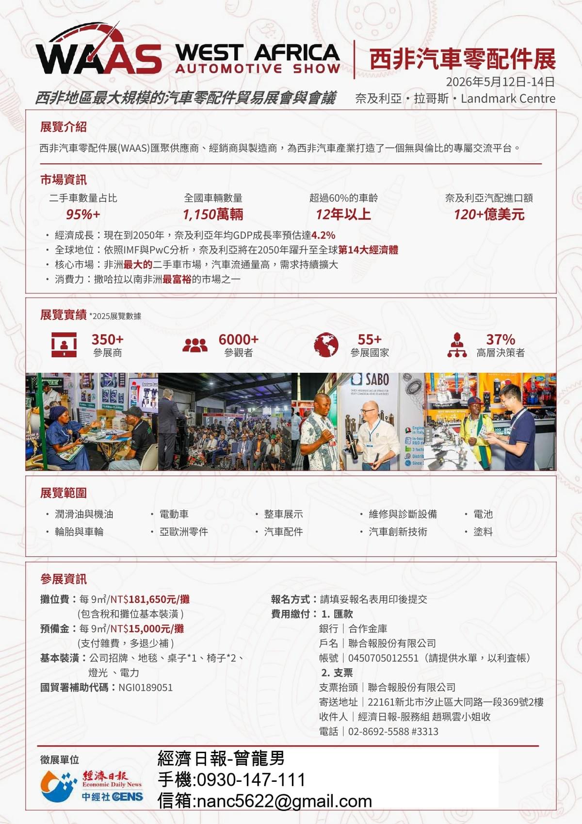 2026年西非汽車零配件展(WAAS)將於2026/5/12-14於奈及利亞拉哥斯舉辦,是西非地區最大規模的汽車零配件貿易展會與會議。匯聚供應商、經銷商與製造商,為西非汽車產業打造了一個無與倫比的專屬交流平台。