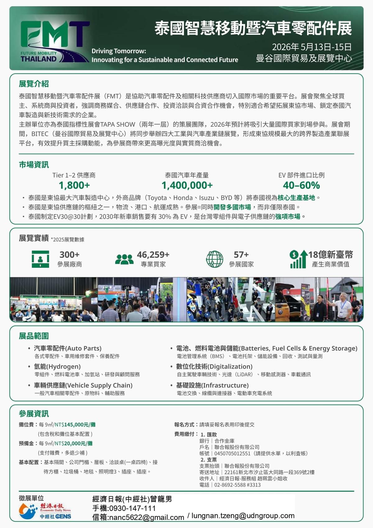 2026泰國智慧移動暨汽車零配件展 (FMT)「2026泰國智慧移動暨汽車零配件展 (FMT) 」將於2026年5月13日 -5月15日於Bitec (曼谷國際貿易展覽中心)舉行,展會期間,BITEC 將同步舉辦四大工業與汽車產業鏈展覽(TyreXpo Asia, INTERMACH、SUBCON, Plastics& Rubber Thailand),形成東協規模最大的「跨產業製造展群」,有效提升買主採購動能,為參展商帶來更高曝光度與實質商洽機會。展館相通,讓買主與供應商洽商更容易。
