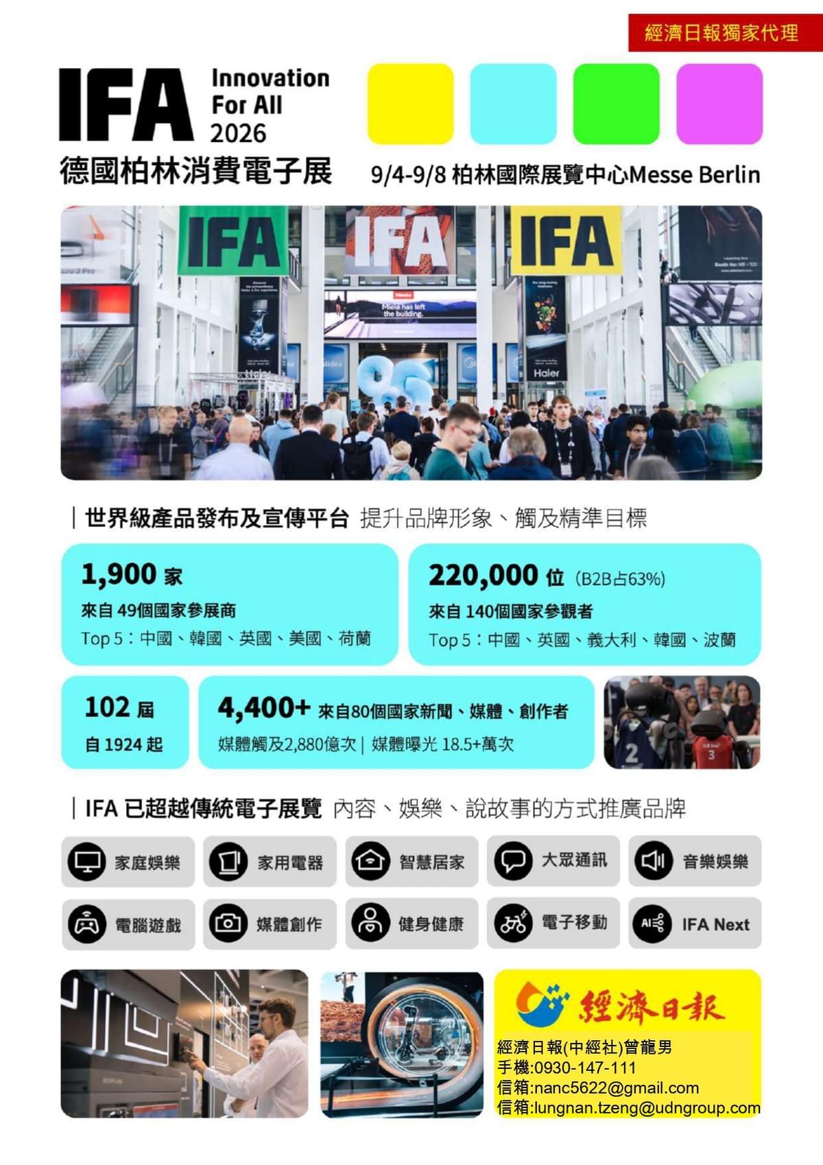 【IFA 德國柏林消費電子展 2026】熱烈徵展中!今年經濟日報台灣獨家代理-IFA 德國柏林消費電子展 2026,此展為全球家用與消費電子產品最具規模及影響力的展覽之一,匯聚世界頂尖品牌、創新科技,一站串連B2B買家 及 B2C消費者,是世界級產品發佈及宣傳平台,上屆吸引來自49個國家計1900家全球製造商參展,是進駐歐洲消費電子市場的首選~