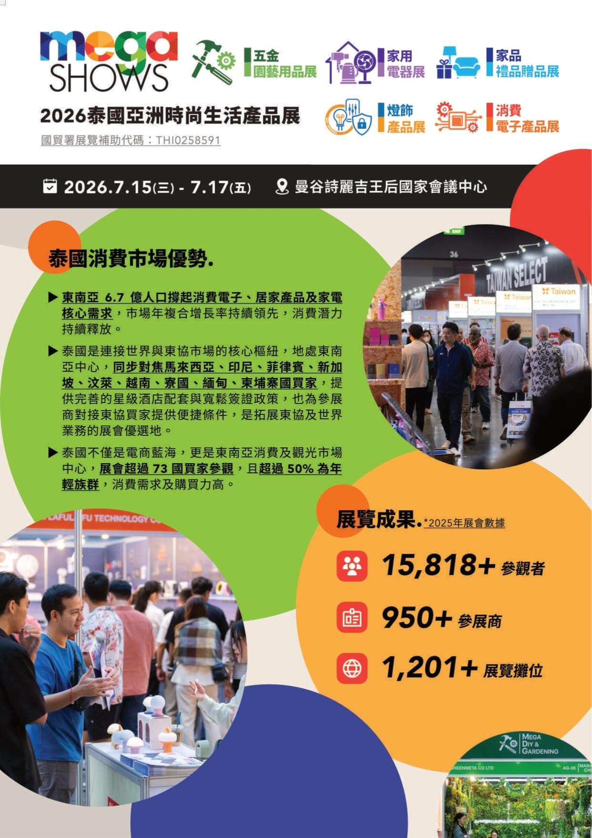 【2026泰國Mega Show】燈飾產品展、消費電子展、五金及園藝用品展,三大展區,徵展開始!~