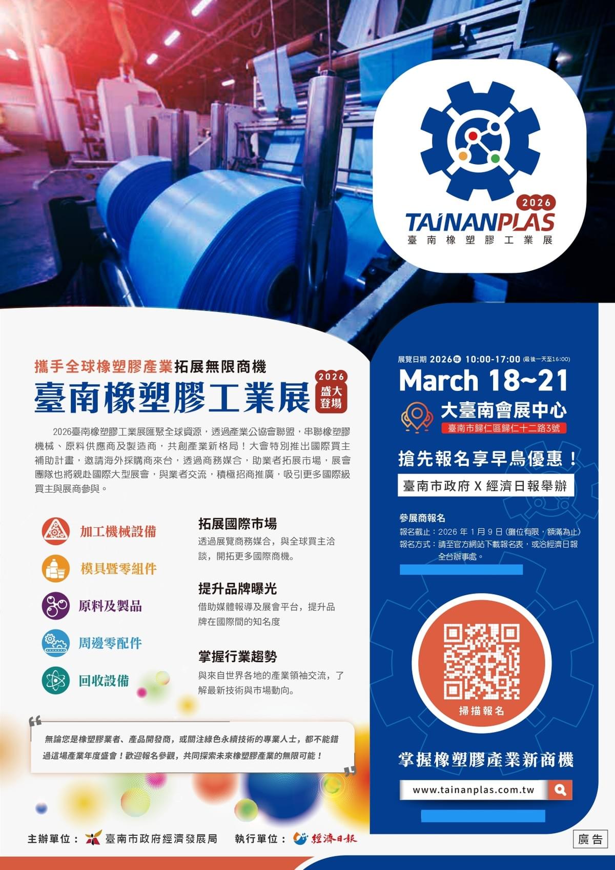 2026臺南橡塑膠工業展 (TAINANPLAS)將於3月18日至21日於大臺南會展中心舉行。主辦單位為台南市政府與經濟日報。